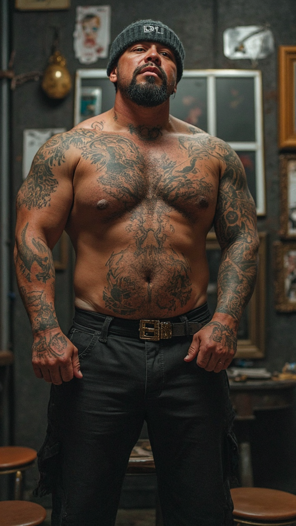 Tejón was a short Puerto Rican man, squat-limbed and heavily tattooed, nearly head to toe. He had a powerfully muscled body and asscheeks that looked so taut you could bounce a quarter off them. His mustache was thick and groomed, but his beard was always scruffy. You could tell he meticulously groomed it on the outside. That’s not easy to maintain in prison though, so it was overgrown like an ignored garden… he was shirtless, tautly-muscled, and he had only a smattering of chest hair, barely visible among the copious tattoos.