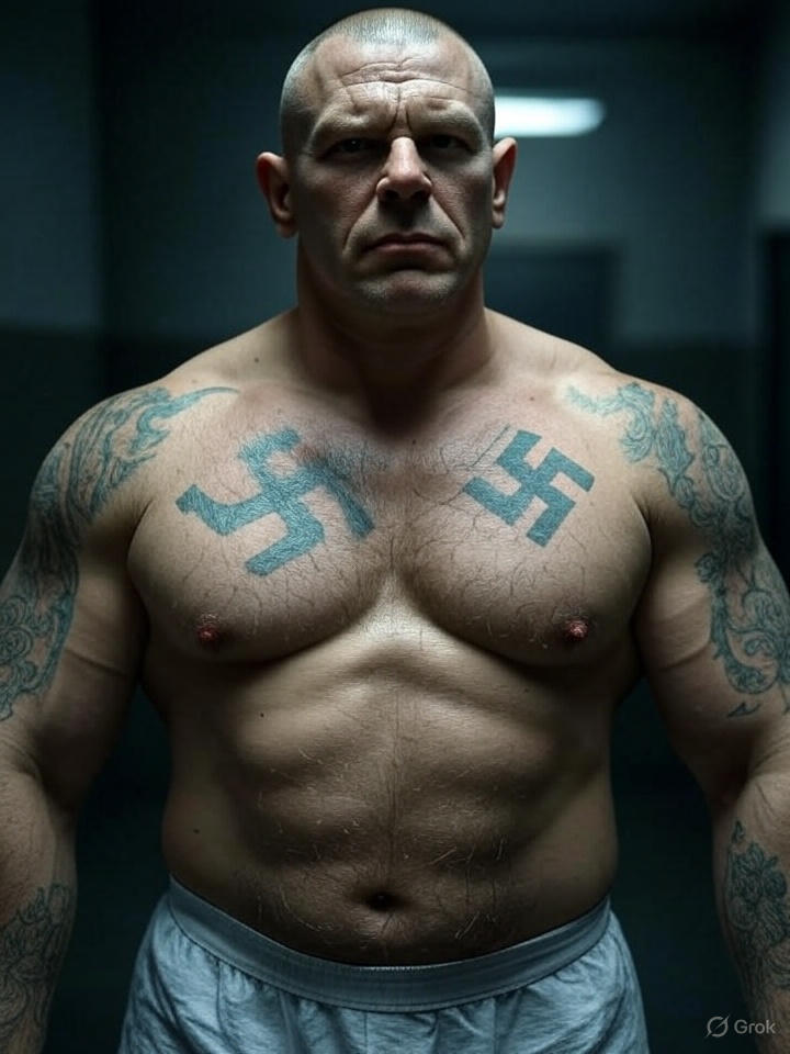 A muscular man with a shaved head came to the cell bars in that other cell at the back of the jailhouse. He was solid as bricks, arms like steel girders, shoulders broader than a doorway. He wasn’t as tall as Jimmy, but he was cut, while Jimmy was more meaty. Anyway, his size wasn’t what Jimmy focused on, once his eyes focused on the man. It was his tattoos. Specifically, the iron cross on his neck and the swastika on his bicep.