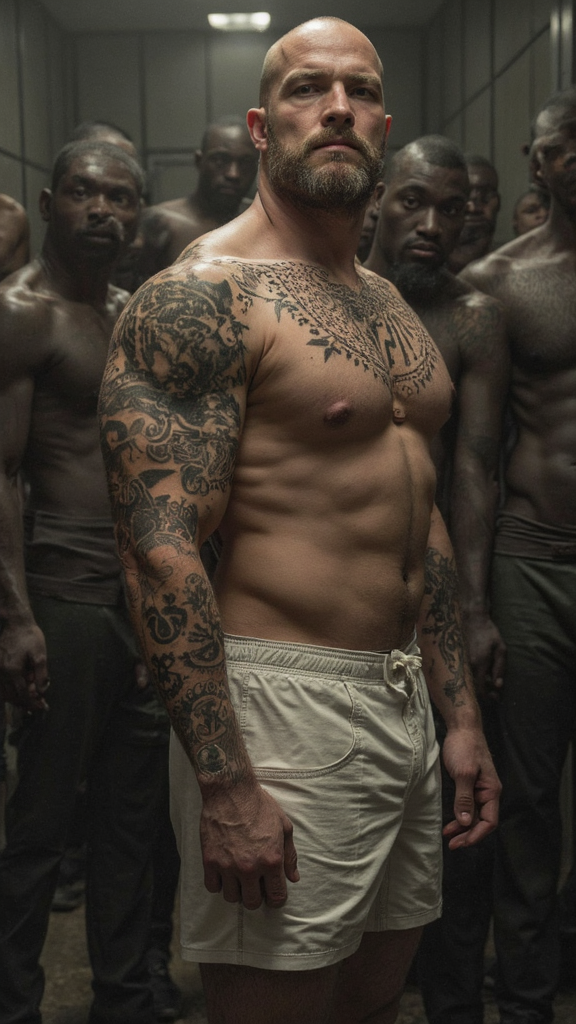 Officer Goober came back out a few moments later, followed by a stately man with broad, alabaster shoulders contained within a strappy wifebeater. His muscles barely fit beneath the fabric. He had a tight six-pack, barely visible because that wifebeater was too small for him and had a giant hole in it, and he wore a pair of sweatpants that you could tell were his pajamas. His eyes were dim and clouded, like Goober had just woken him up. It took Simon a minute to realize that was Hassle. The swastikas tattooed over his heart, belly and shoulder were the giveaway. He also had the name HASSLE tattooed across his neck, but it was harder to make those letters out because they were shadowed by his square, jutting jaw. The big dark blob of a tattoo on his chest was Hitler’s flinty face. Hassle was as strong as Buck, maybe, Simon thought, or at least close to it. He was shorter than Buck by a little. And he was basically hairless, very much unlike Buck. Hassle had a shaved head like an albino cue ball, and his chest was just as smooth — either naturally hairless or maybe he shaved that too. Simon hadn’t got a look at his legs because he was wearing those sweatpants. Now those sweatpants were crumpled up on the floor by the bunk. His back was tattooed with the number 88 and some arcane Gothic lettering. Simon moved closer to read it, only for Hassle to let go of his cock because the angle was awkward. Simon pressed his dick on the meaty muscle between Hassle’s shoulder blades, right on an unidentifiable shape (which Simon gathered was a crude map of the Nazi empire at its height).