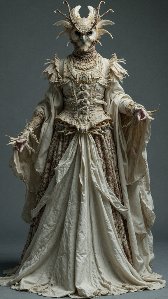 Beneath a lacy hood like a owl’s head, battle-spike leather and satellite dish feathers surrounded around her mask. A porcelain corpse, she stood like a goblin, in a necklace of coffins, dress waffling in a breeze Thumper ain’t feel. Buggy-mugging, Thumper’s stout mouth and burnt tongue crowded about curtly, but no words emerged to be heard. She silently brayed like birds and bees. Fabric faded like a murky wheeze, silent as a lady’s pleas, lined with lace from rusty seas, the musty dress must be dusty like shaker cheese. Her flaky bust squeezing together with the mask and the ghastly dress made up a way Thumper’s brain couldn’t grasp.